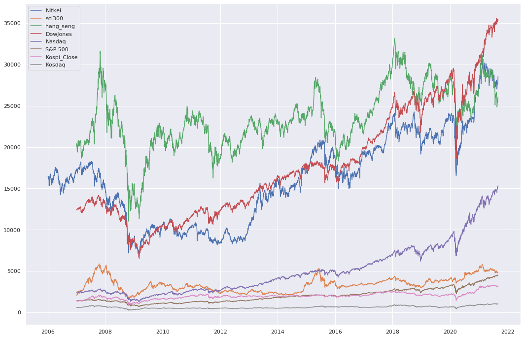 하지만 fdr로 불러오는 데이터의 시작 일은 지수마다 달랐고 인베스팅 닷컴, 야후 파이낸스, 네이버/다음 금융에서 찾을 수 있는대로 다 긁어옴. 여기서 또 매일 최신 데이터는 업데이트 되어야 하므로 fdr데이터에 합치는 방법을 써야했다.