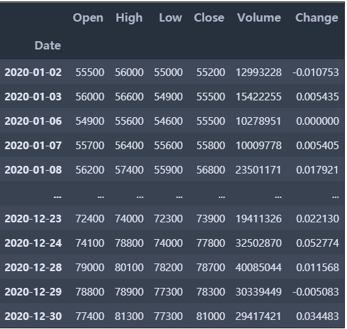 불러오고 나면 이렇게 시작가, 고가, 저가, 종가, 거래량, 변동률의 형식이 나온다.